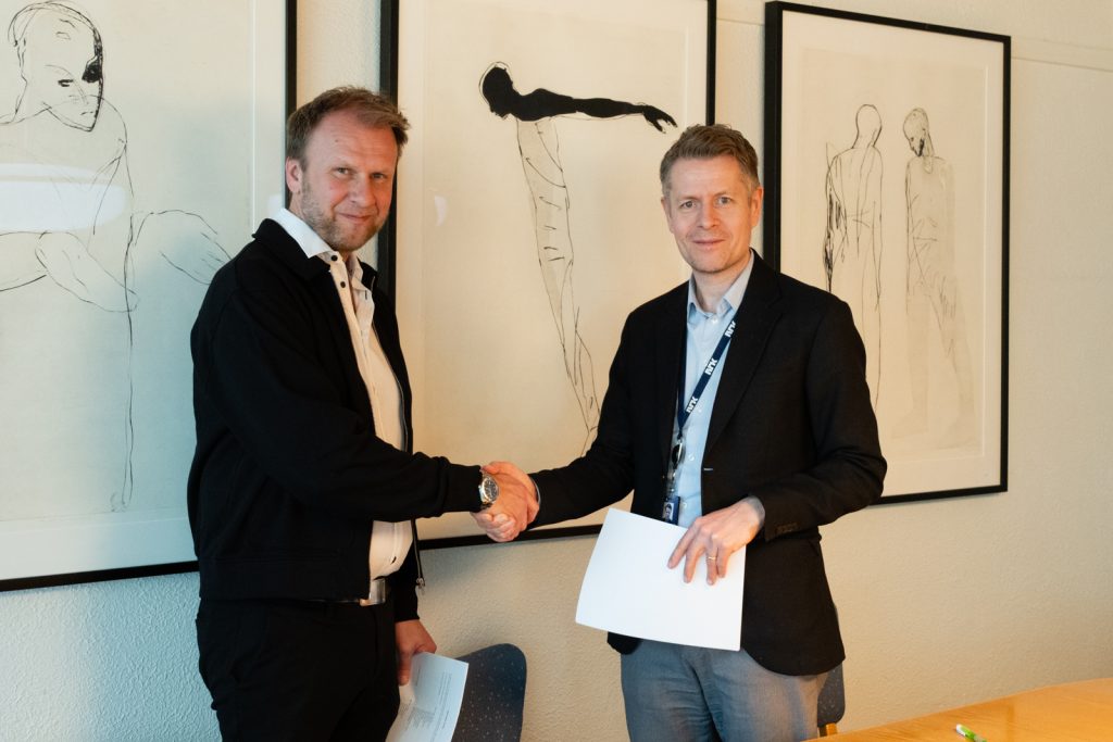 Forhandlingsleder i NJ i NRK, Atle D. Bjurstrøm og forhandlingsleder i NRK, Olav Hypher signerte protokollen fredag ettermiddag. Foto: Christine Tolpinrud/NJ